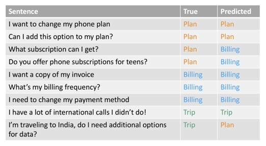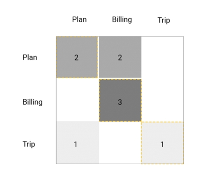 The confusion matrix gives us an overview of predicted intents versus expected intents and it helps us answer questions like “When the expected prediction of a user’s sentence is Plan, what did it actually predict?”.