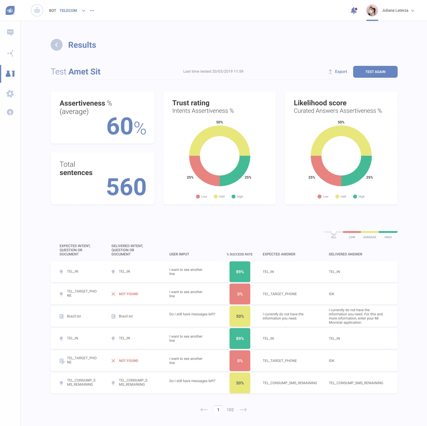 To guarantee that a virtual agent delivers the right answers to every question users might ask, Syntphony CAI allows you to test intents, documents, and questions and check if your virtual agent answers match what you expect.