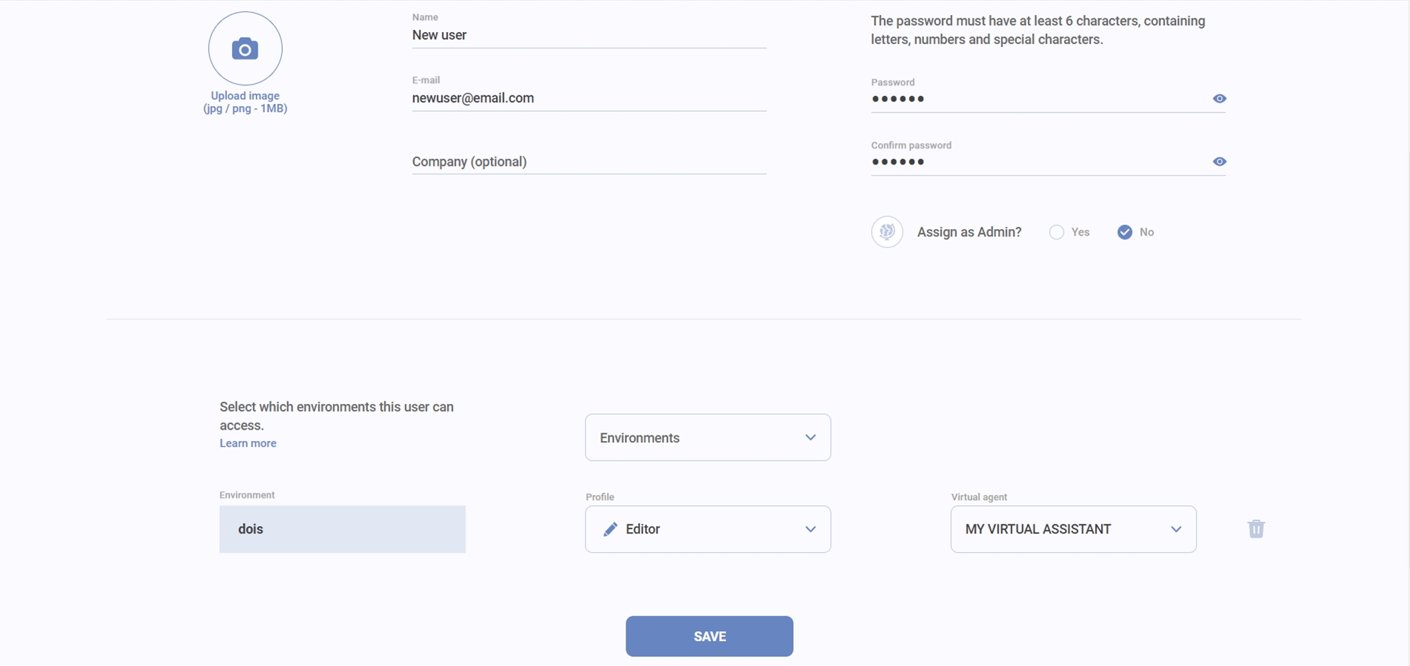 If the new user is not assigned as Admin, you'll see a new section and you'll be asked to select a profile and which environments and virtual agents this user will have access to.