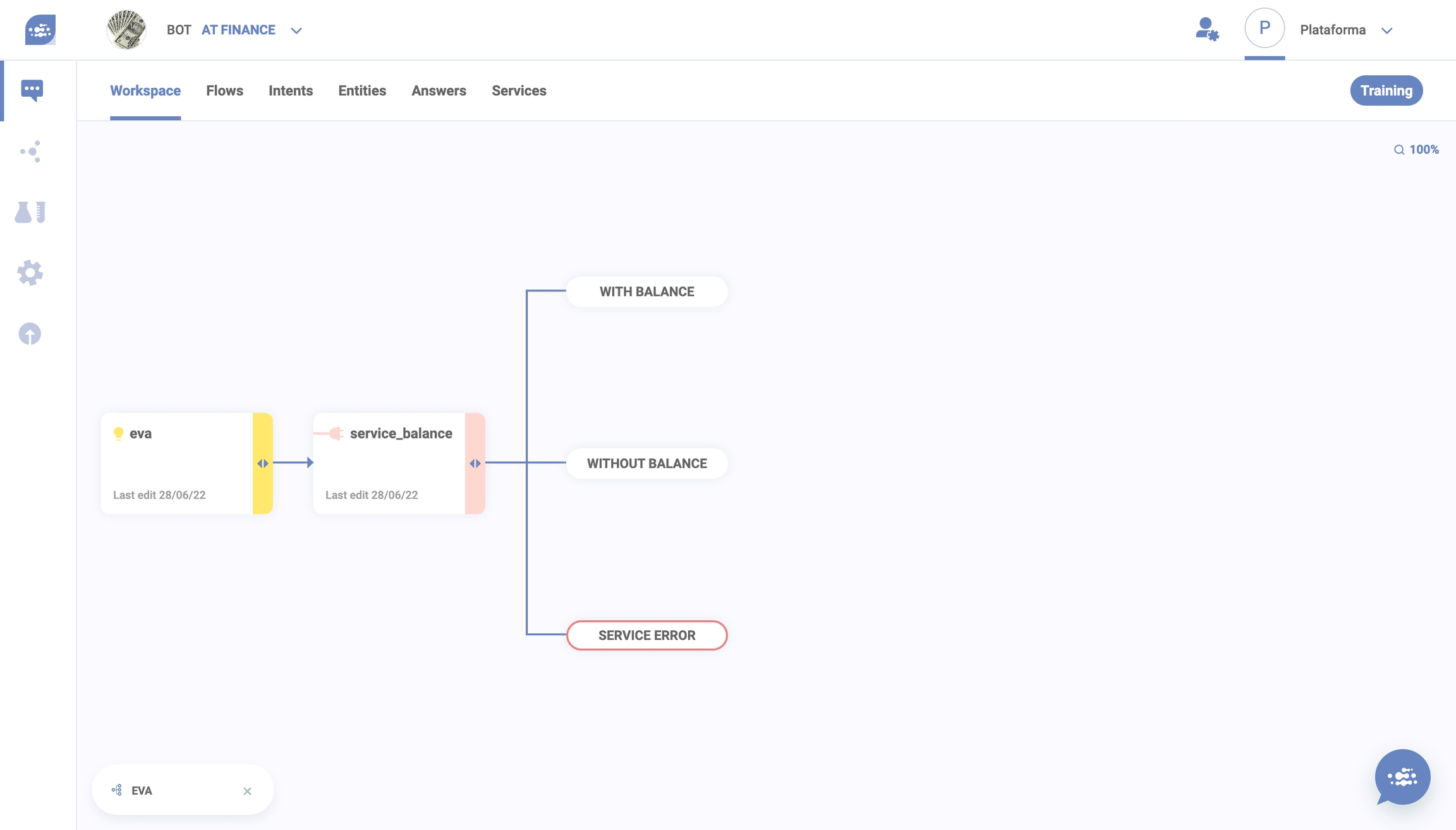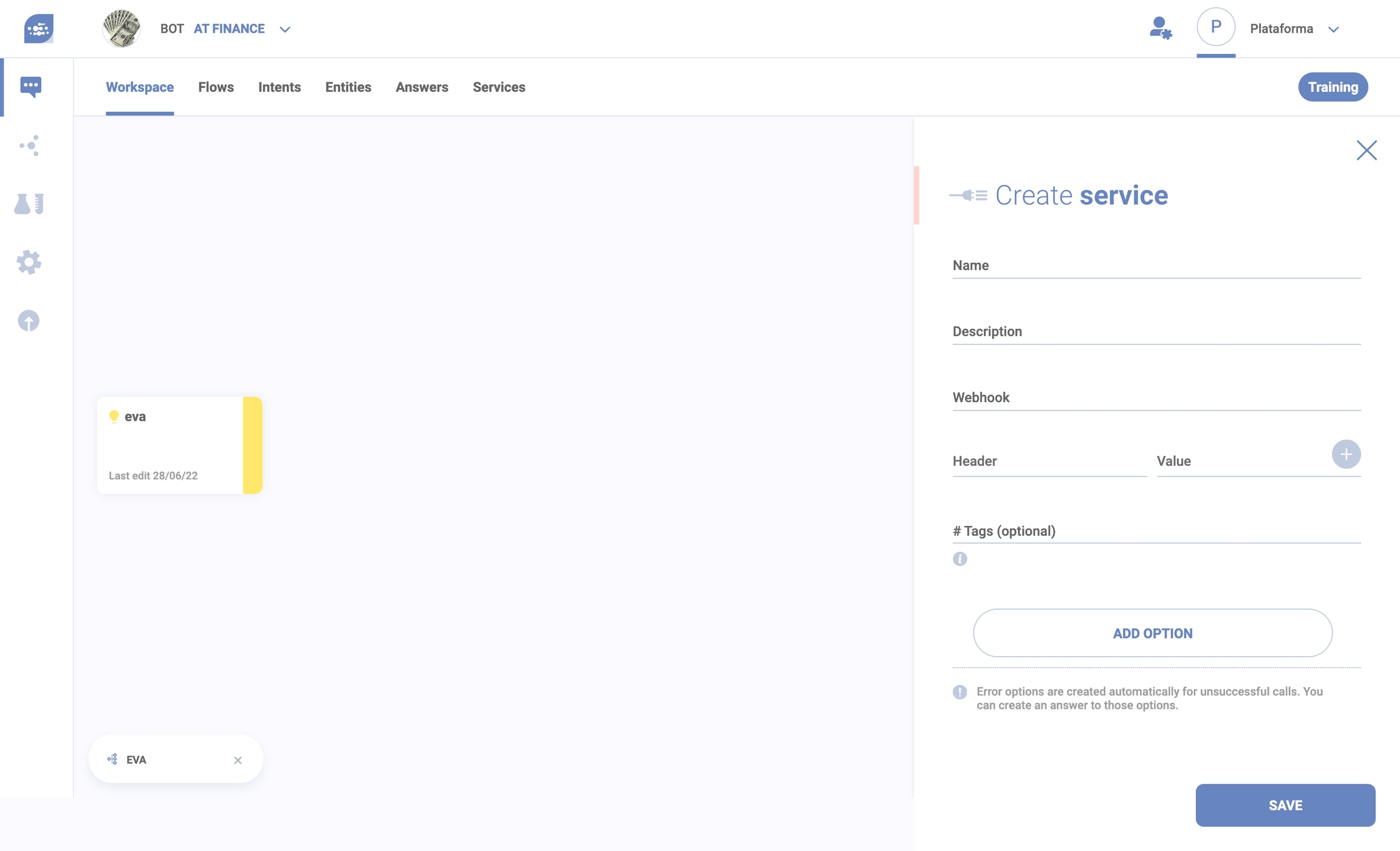 External services might not work. So, eva creates a service error option automatically. As service errors are treated by eva like any other service option, you can add answers after it.