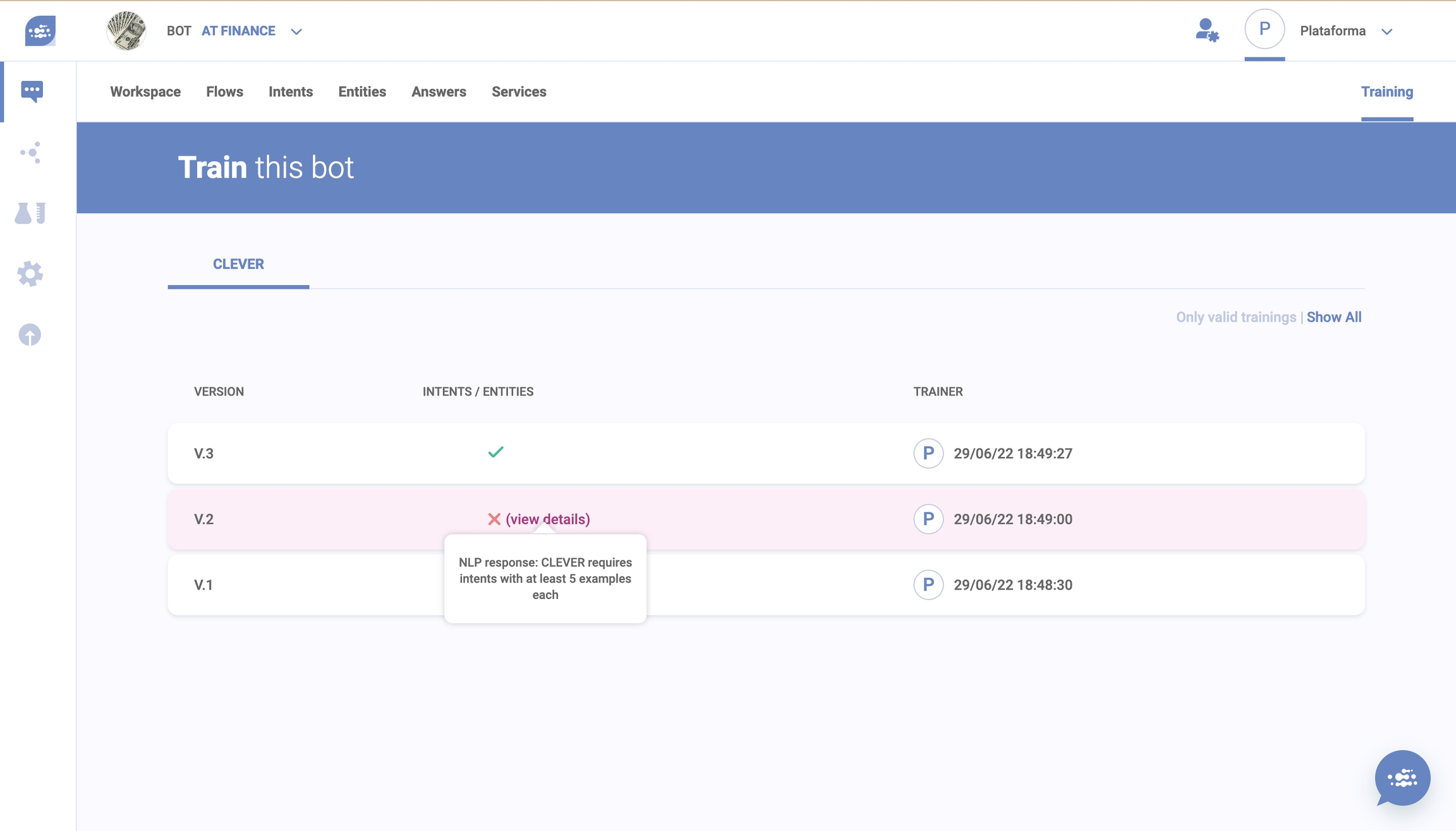 To train a flow in eva NLP, you must have at least five (5) intents with at least five (5) examples each. A virtual agent will not be trainable if it has any intents with less than five (5) examples.