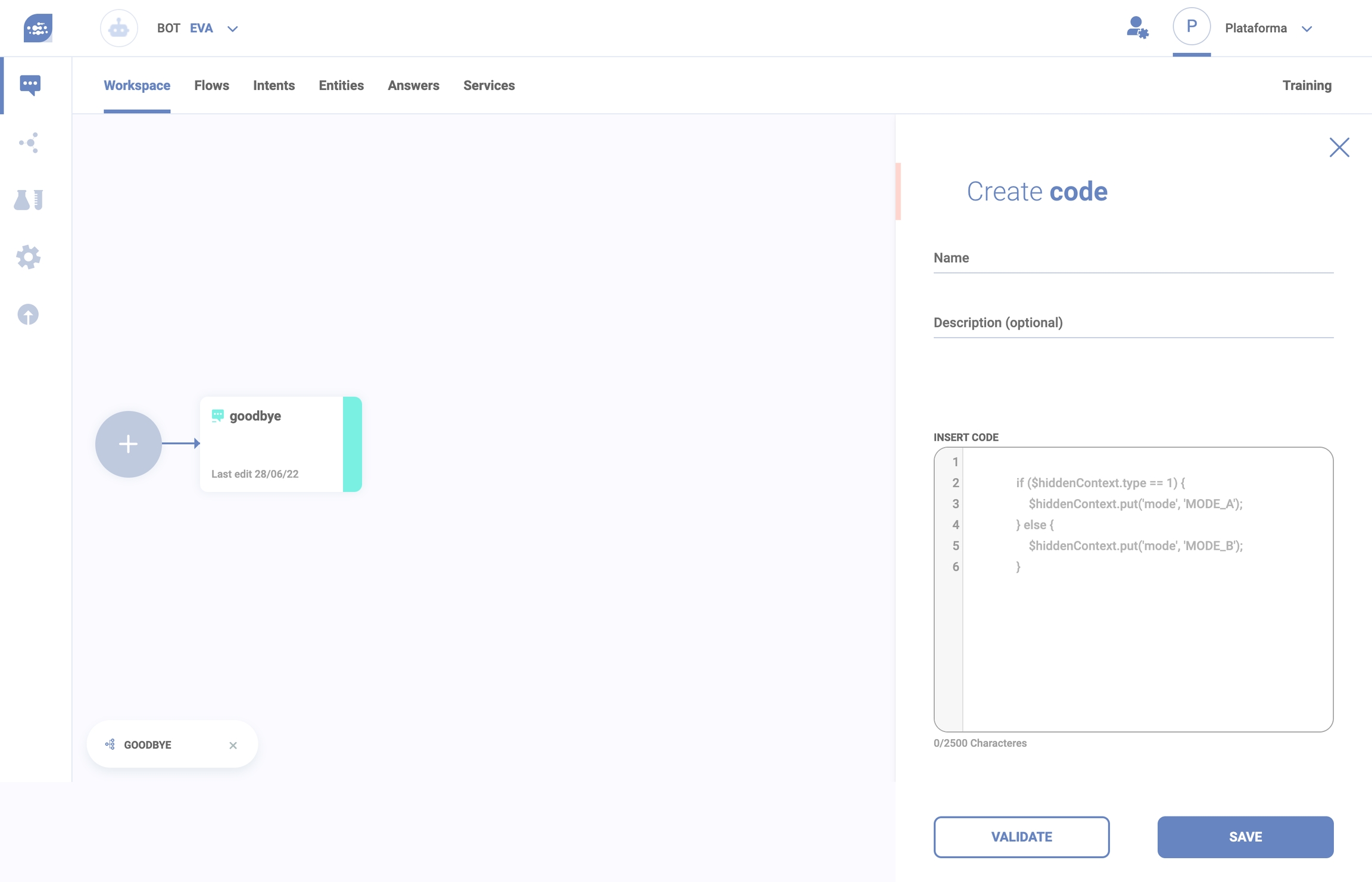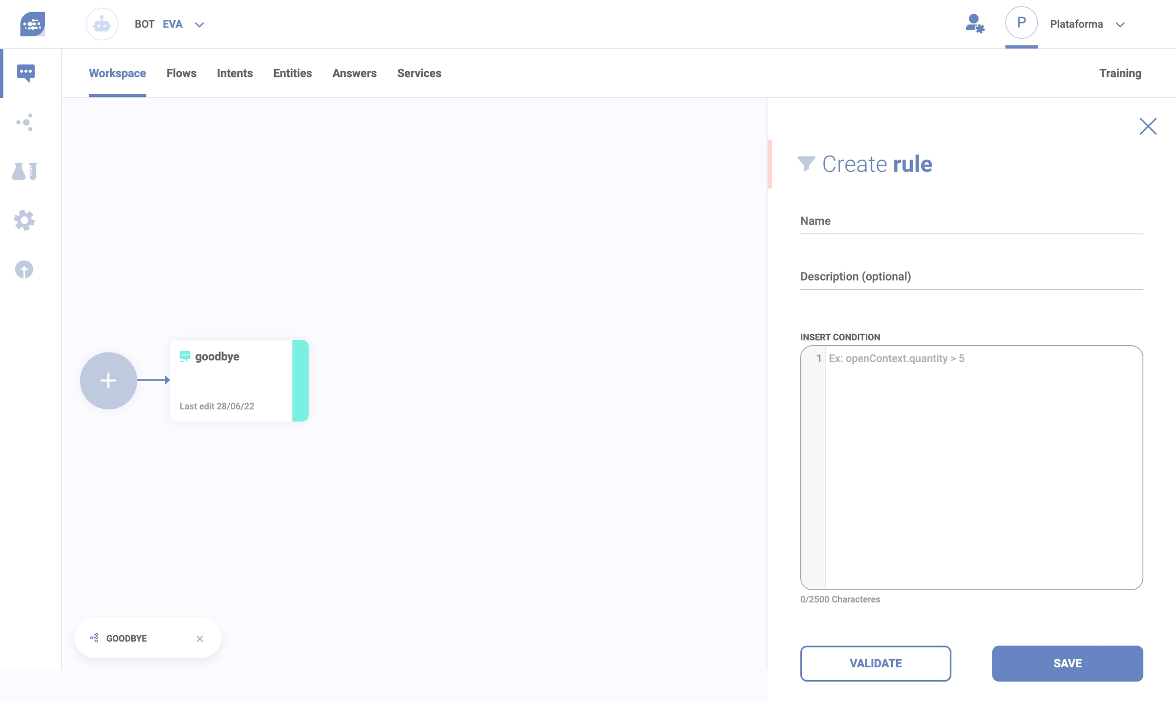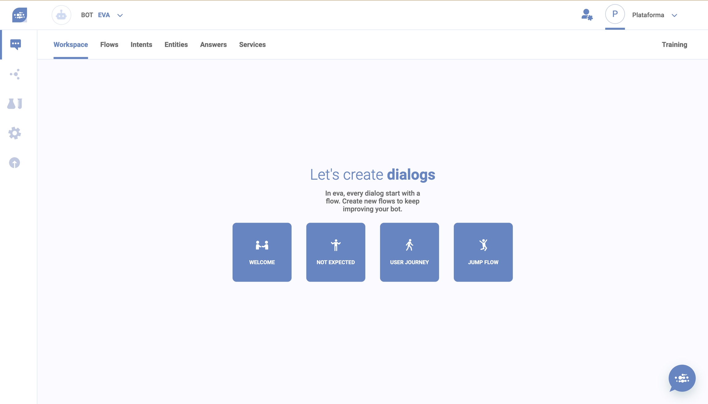 Main feature in eva, it's the workspace where you can create dialogs and build your virtual agent knowledge base.