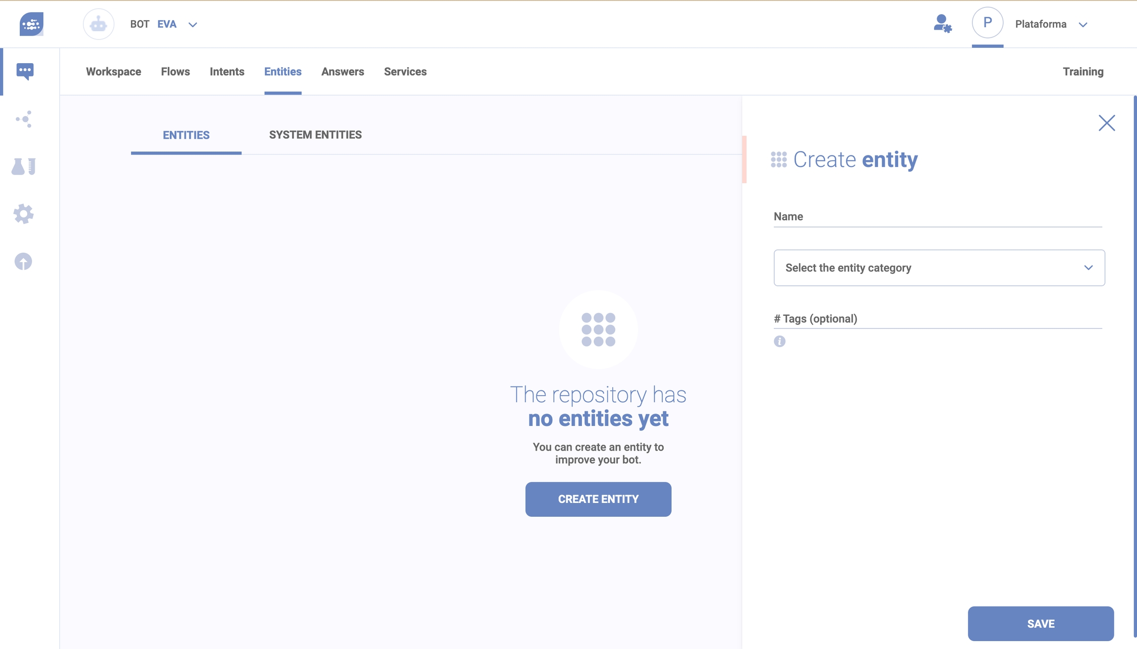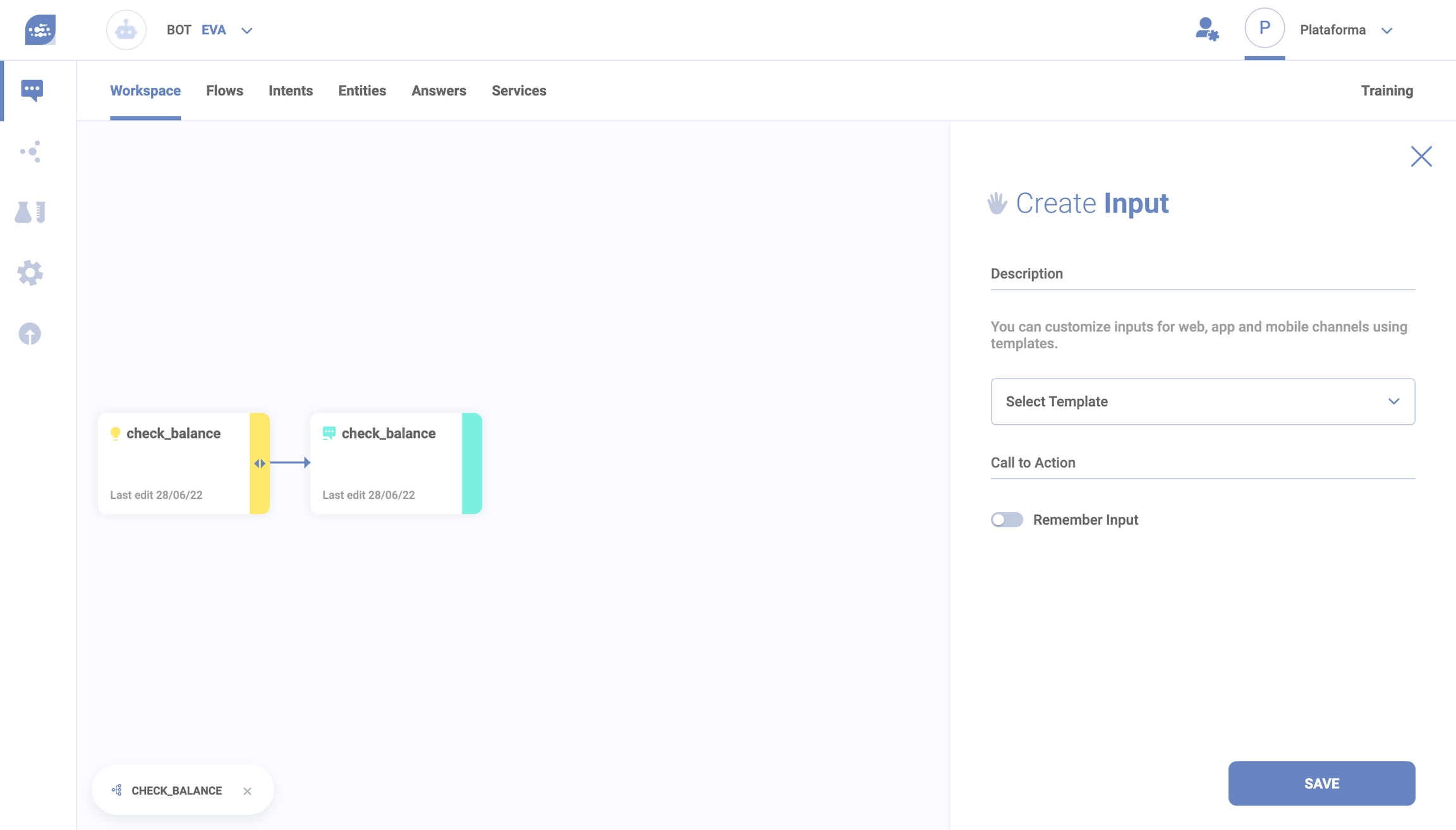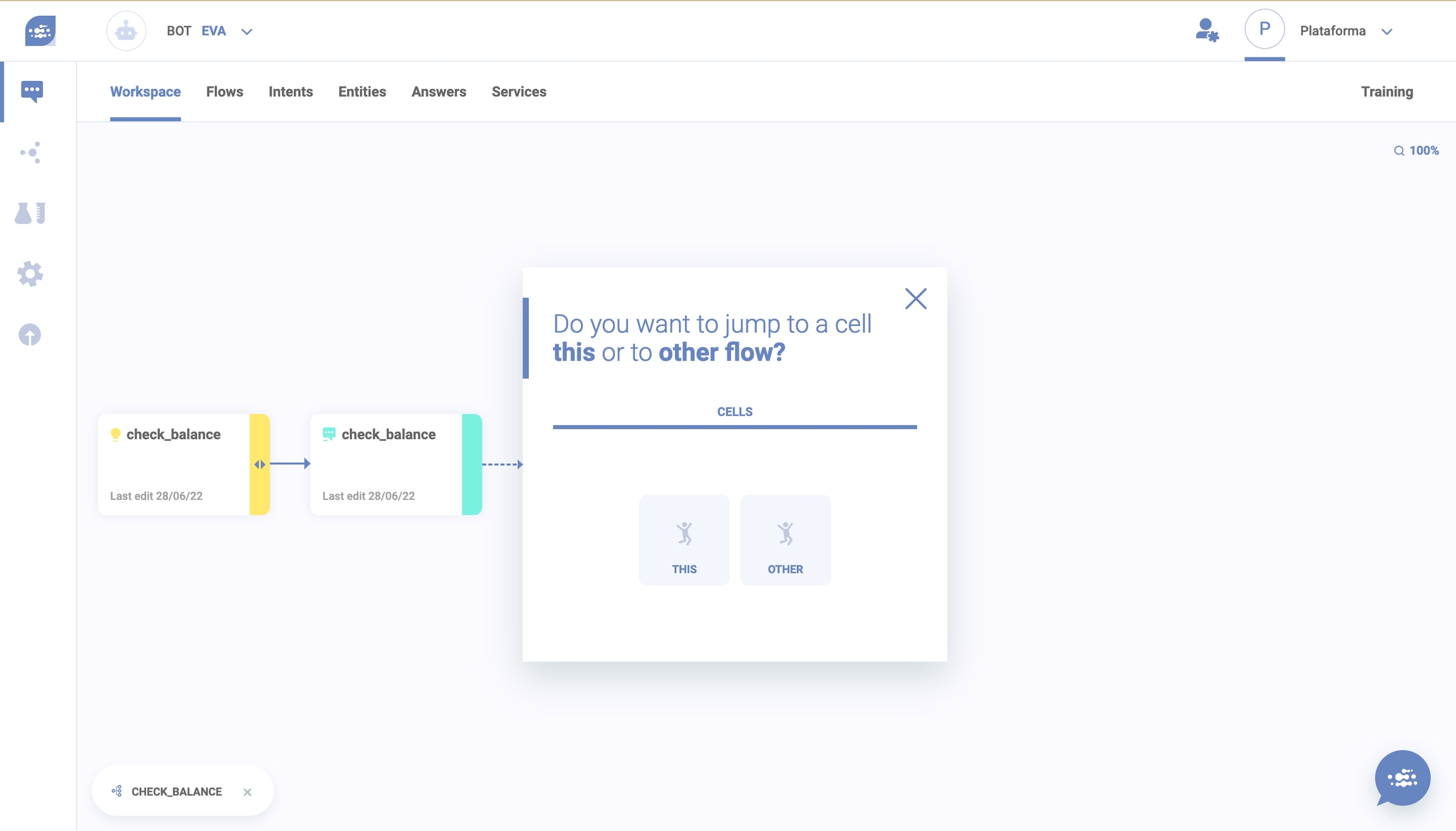 Main feature in eva, it's the workspace where you can create dialogs and build your virtual agent knowledge base.