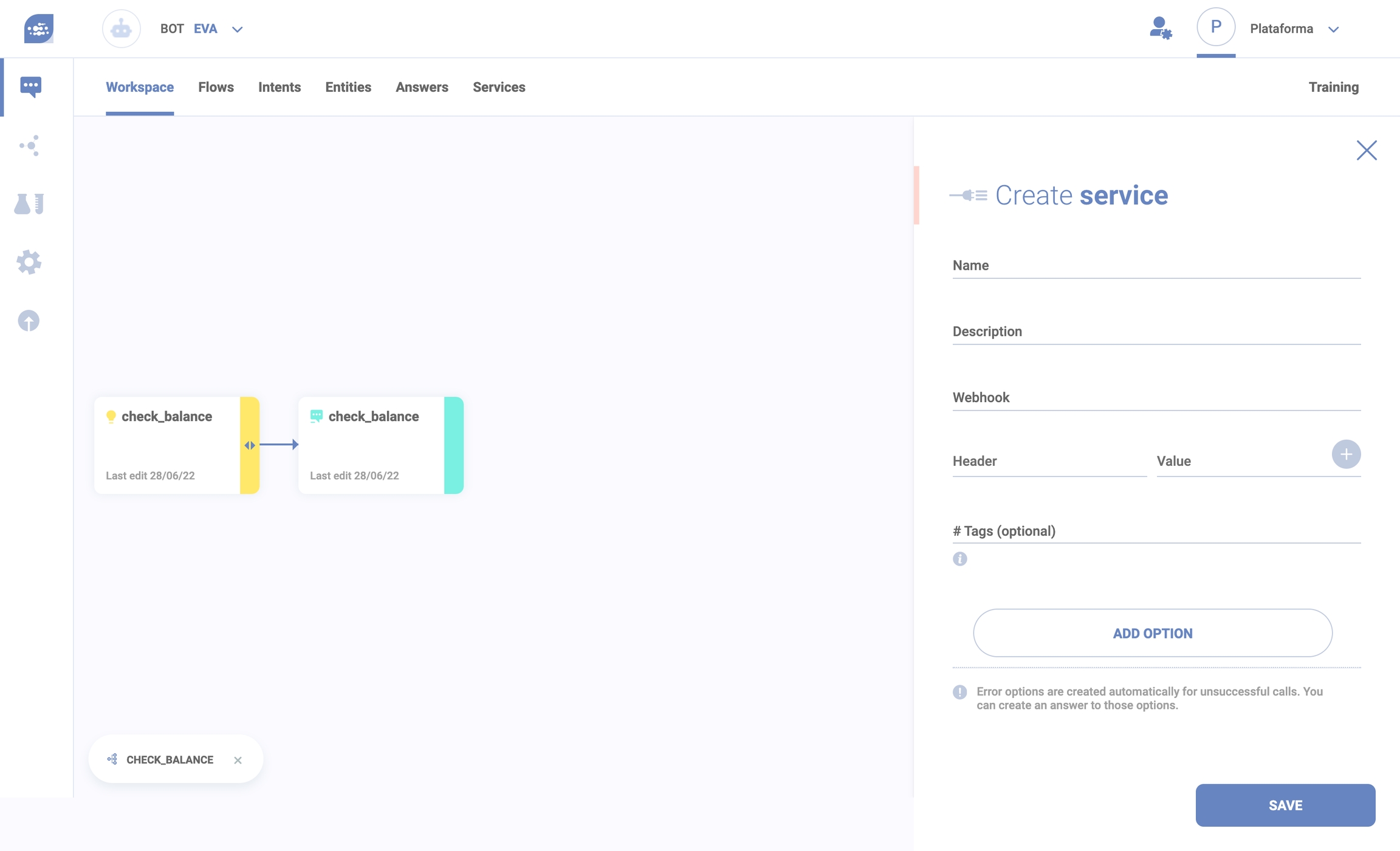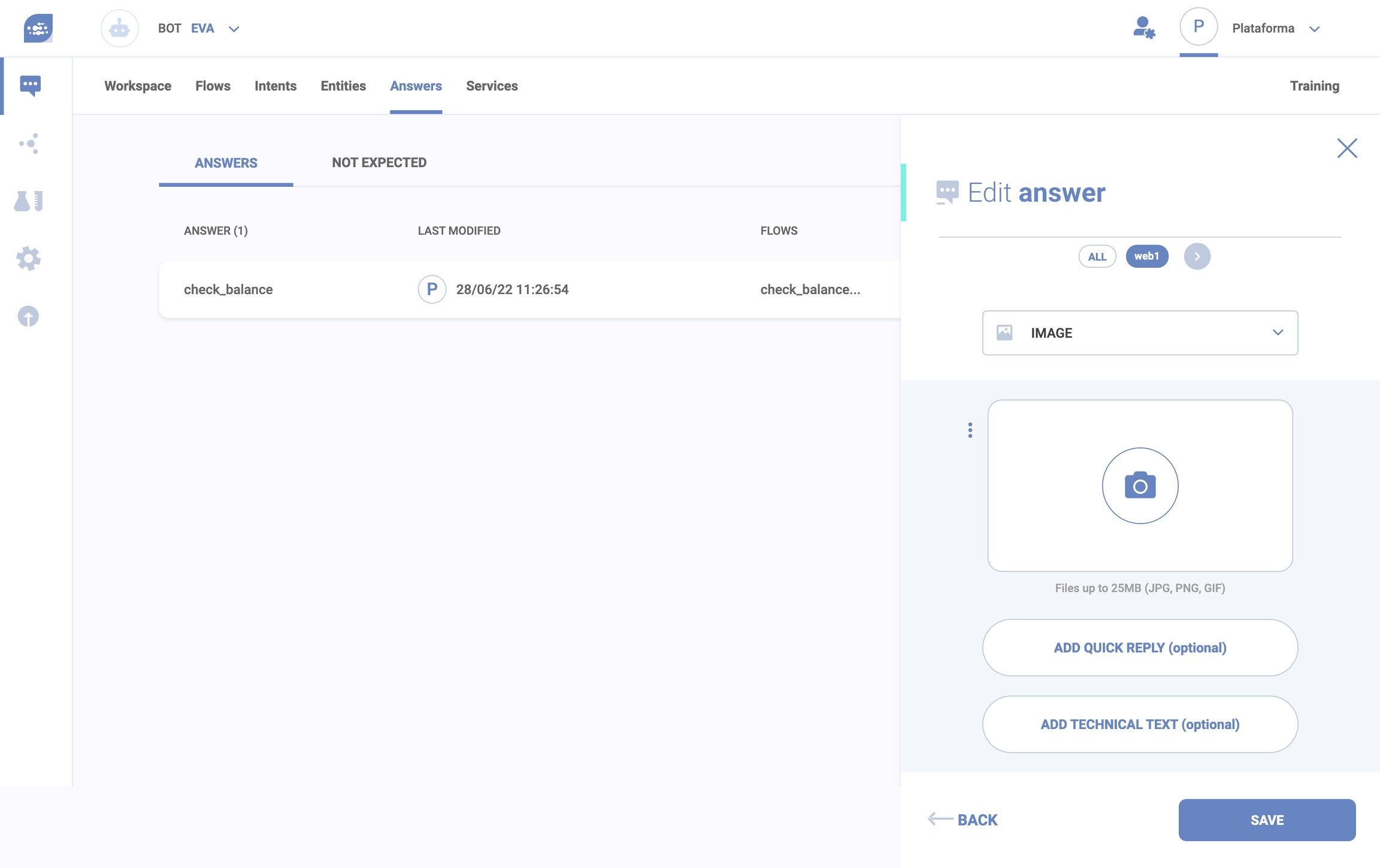 eva allows integration with different cognitive engines, like eva NLP (NTT DATA), Watson (IBM), Dialogflow (Google), Luis (Microsoft), and others.