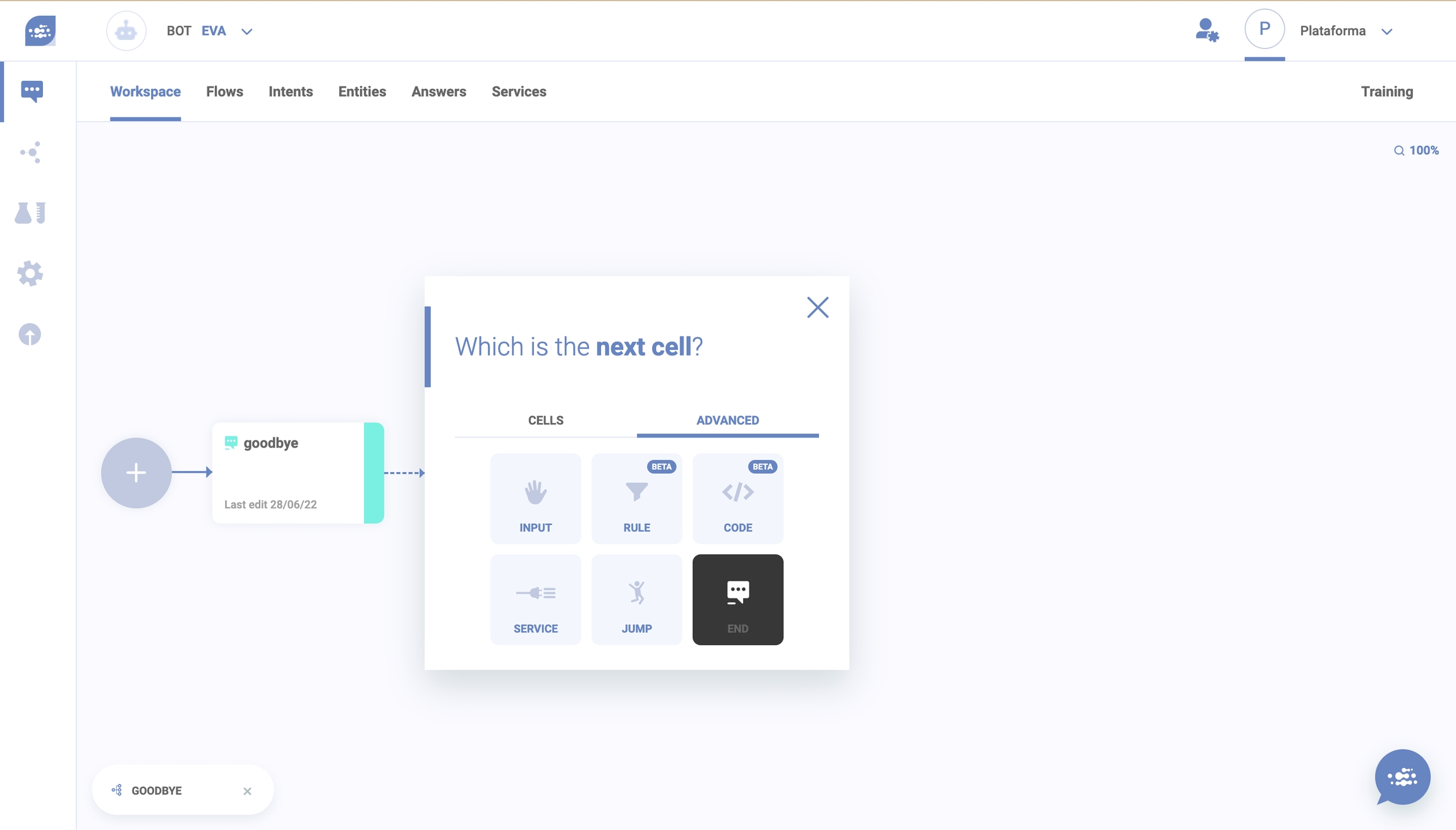 The End Cell works like an end point in a flow. By placing this feature, the virtual agent stops communicating at that point. That is, it will only resume the dialog if the user (the virtual agent's interlocutor) interacts again.
